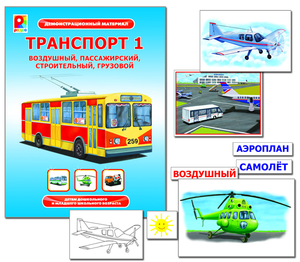 Демонстрационный материал состоит из 3 сюжетных карт, относящихся воздушному, водному, пассажирскому транспорту, 9 карт с видами транспорта (по 3 карточки на каждый сюжет).