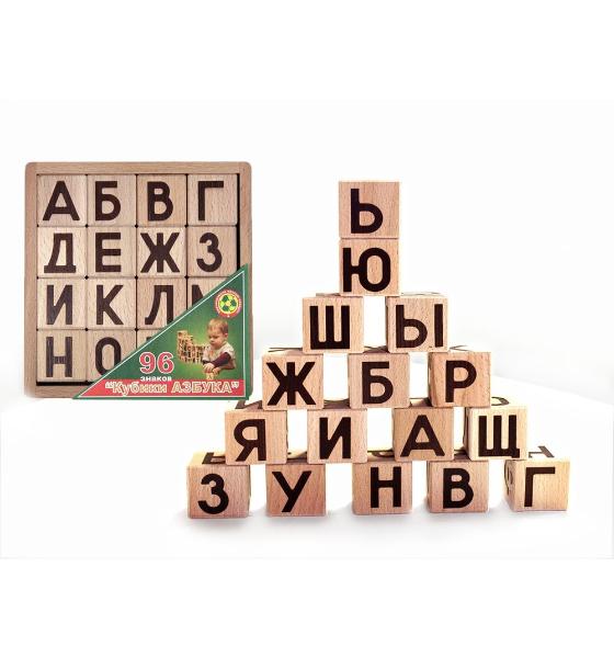 Кубики сделаны из хвойных пород деревьев и не обработаны красками или лаками. Рисунок букв нанесен методом выжигания. Размер грани каждого кубика 3,8 см.