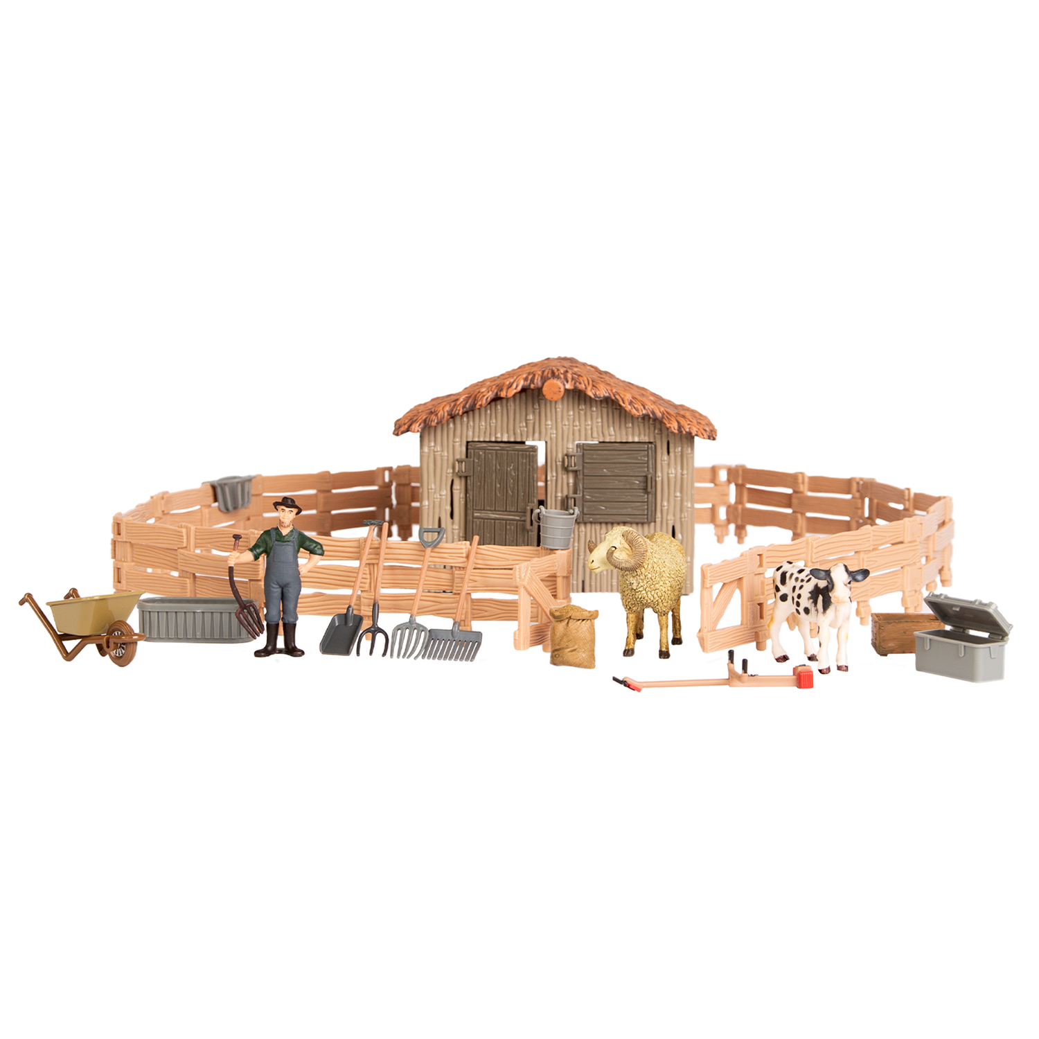 • В комплект входит 17 предметов: домик (36х32х20), загон (25х8х25), баран (10х7х3,5), теленок (8х6х3), фермер с вилами (3х6х3), мешок (3х3,5х2), ящик (4х3,5х3,5), ящик с крышкой (5,5х6х1), ящик серый (5,5х3,3х1), щетка (5х3х0,5), лопата (5х1,5х0,5), грабли (5х3х0,5), вилы 2 шт. (5х1,5х0,5; 5х1,5х0,5), газонокосилка (6х3х3), тележка (7х3,5х3,5), ведро (1,5х2,5).