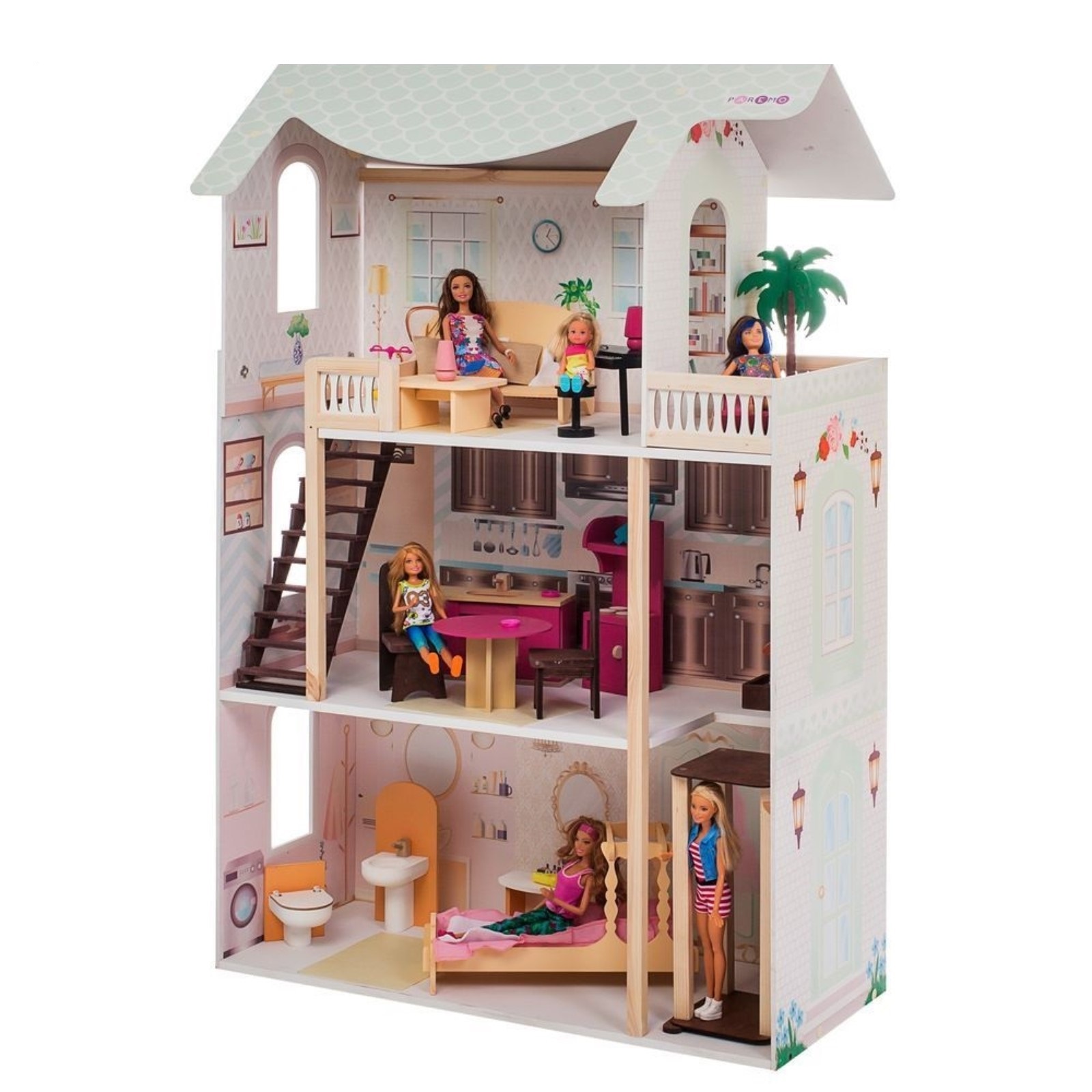 Домик «Гаваи» частично открытый: задняя стенка глухая, все игровые зоны доступны ребёнку с лицевой стороны. Игрушка оснащена интерактивными элементами — роялем и лежаком для животных (издают звуки).