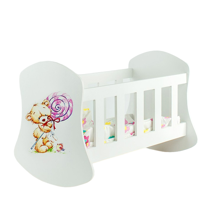 Кукольная кроватка - люлька (Для кукол до 45 см) с полноцветным печатным рисунком на спинке и комплектом белья.