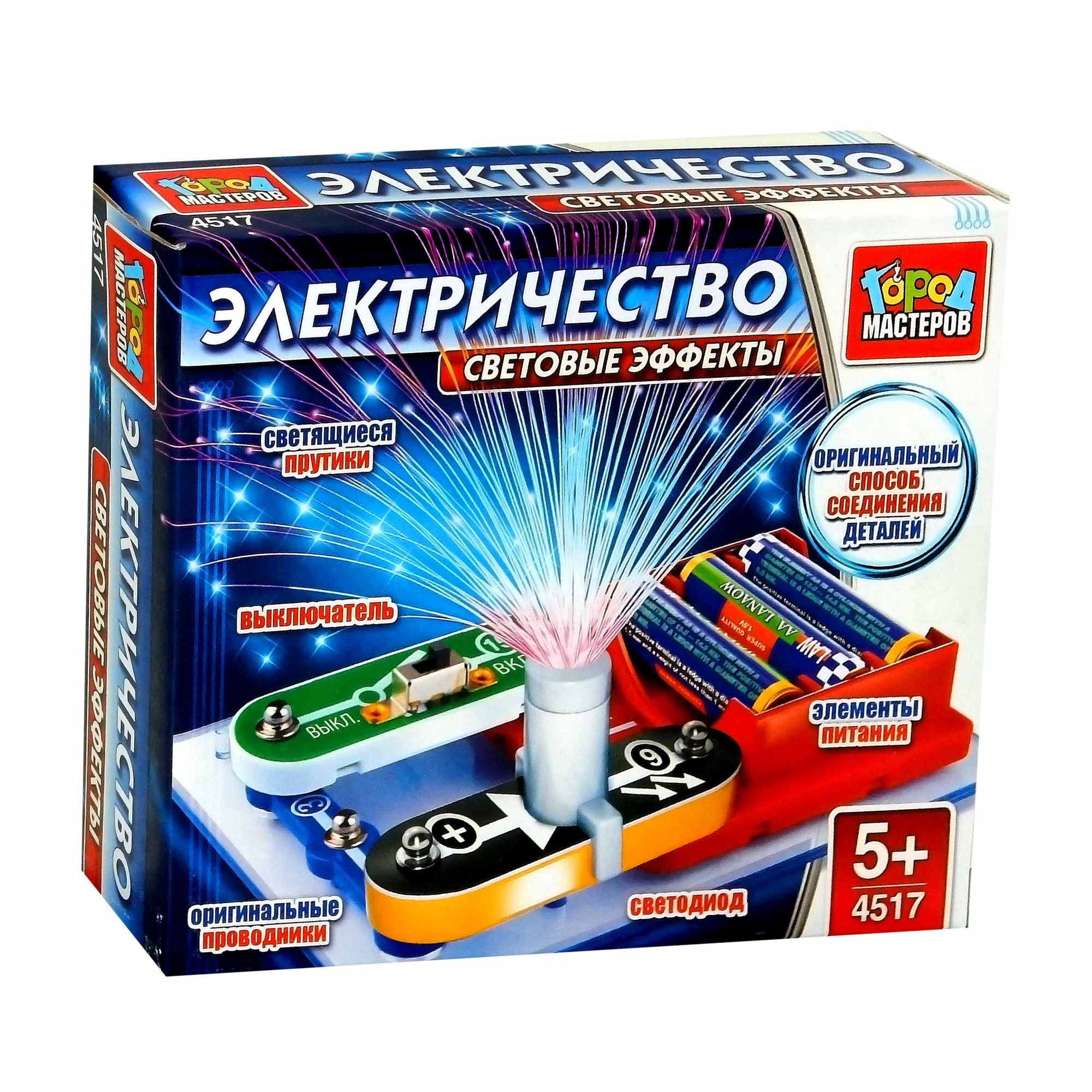 В набор входят выключатель, светодиод, элементы питания и другие детали, собрав которые, ребёнок поймёт схему работы электричества и увидит световые эффекты.